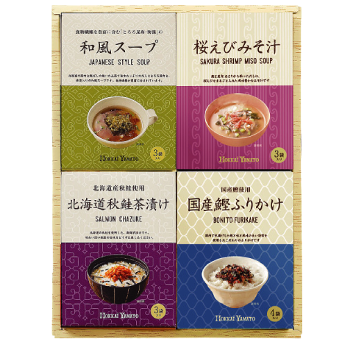 ”北海道秋鮭茶漬け””和風とろろ昆布海藻スープ””桜えびみそ汁””国産鰹ふりかけ”が小分けの袋に入って使いやすい、和の美味しさにこだわった和風ギフトセットです。
